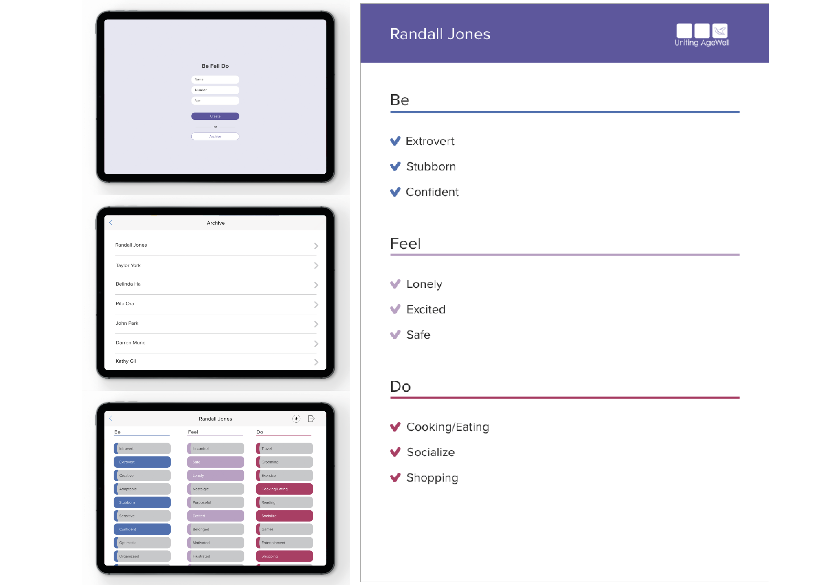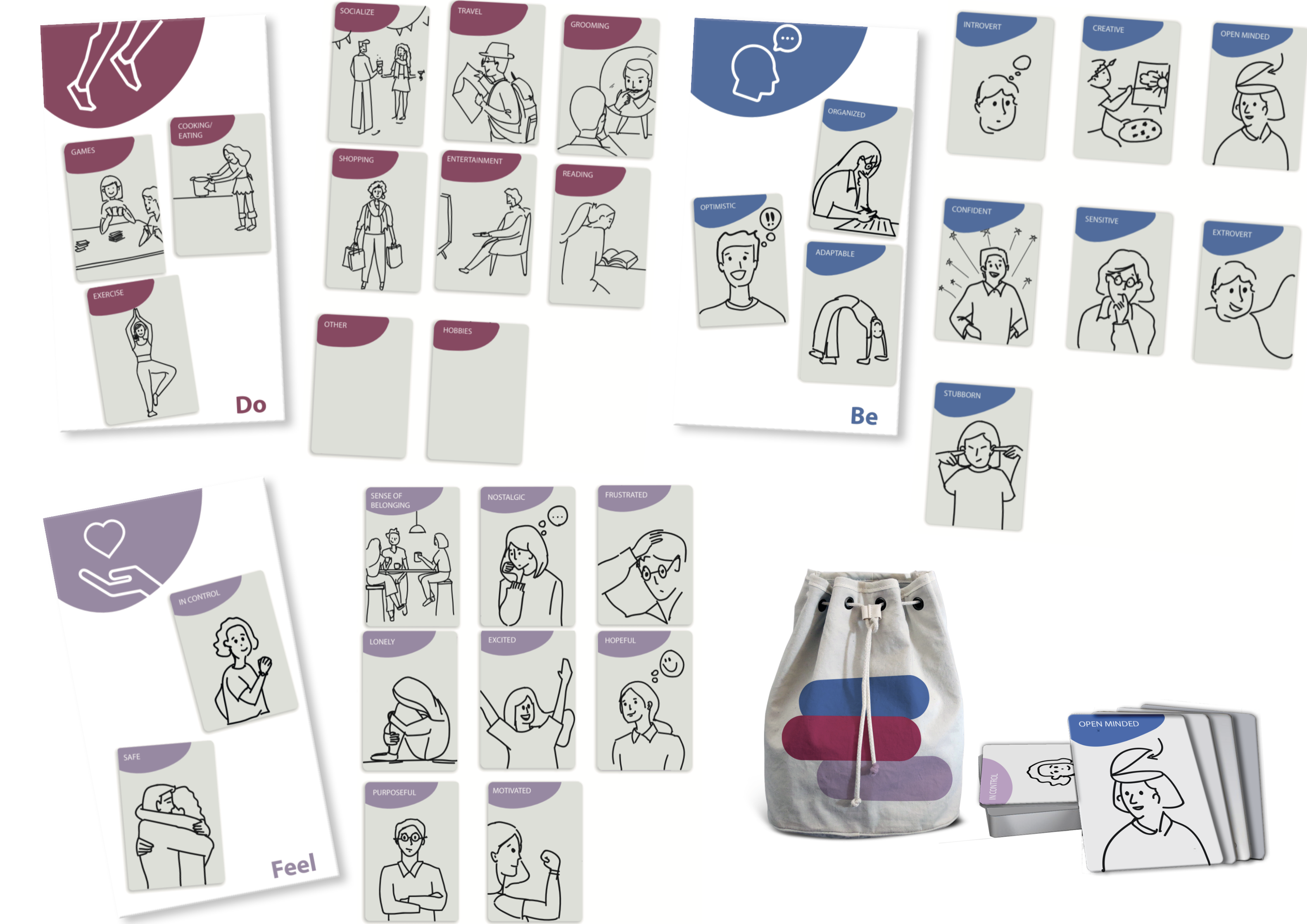 The final toolkit we developed focussed on uncovering deep and rich insights about the personalities of each resident and enable the carers to identify all of them as individuals with a unique identity. We focussed on 3 aspects of their personality – Do, Be & Feel. Each category had 10 cards that the residents could choose from that best represent who they are or want to be. This could give the care giver staff a window into who they are as individuals and foster a deeper & stronger relationship, thereby enabling UAW to provide better services to the residents.