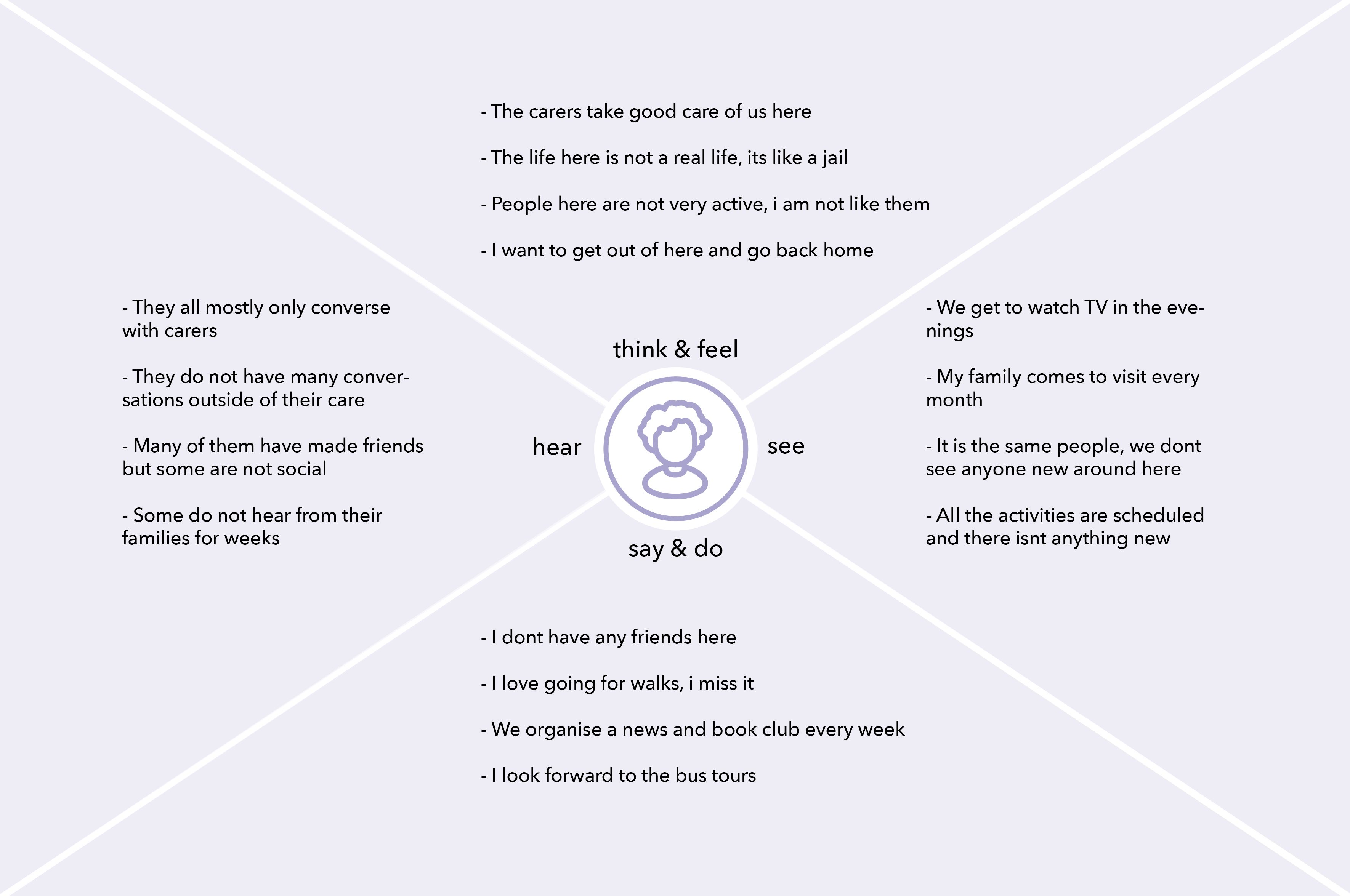 We visited one of the UAW facilities to conduct workshops and get a better understanding of the users (residents). We designed 3 activities that aimed at unpacking data about them as individuals, their perception of the service they receive, their aspirations and their motivators and blocks. We also created Empathy Maps for each of the individuals we spoke to immerse ourselves in their world. The key learning from this workshop was that UAW is failing to recognise them as individuals and catering their unique personalities. There was a need to enable UAW to understand their users more deeply, so that they can provide more sophisticated and catered service to each individual, on top of the excellent medical and general care they provided for.